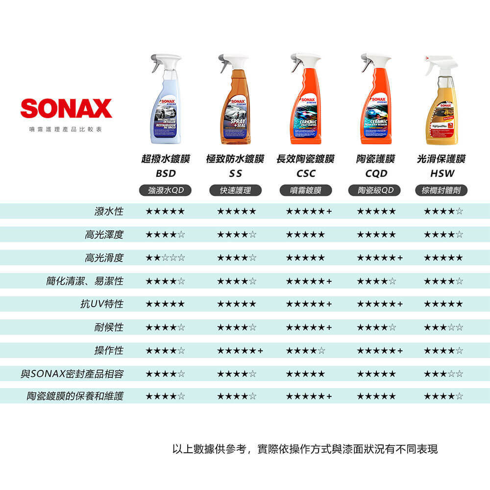 A: SONAX鍍膜採用獨家專利材料Hybrid NPT研發製作 (新款產品則加入SIC矽碳科技材料),為軟結晶鍍膜,與市售鍍膜最大不同就是韌性的提升,面對外力或髒汙侵蝕時將發揮以柔克剛的原理來保護車漆。