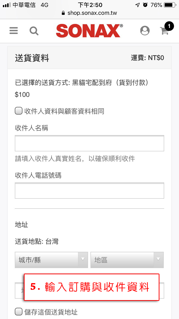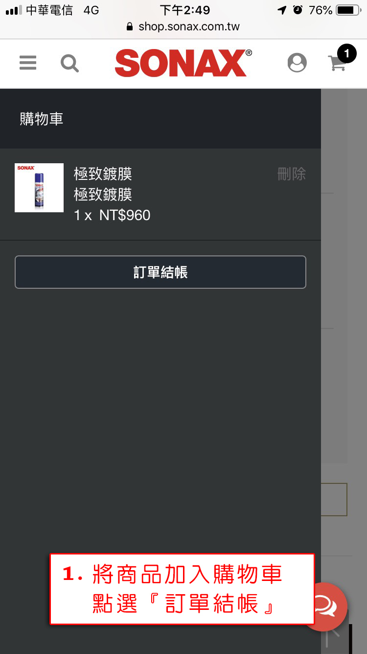 選購商品    →     加入購物車 →  訂單結帳  →  填寫資料  →  送出訂單  →  完成購物