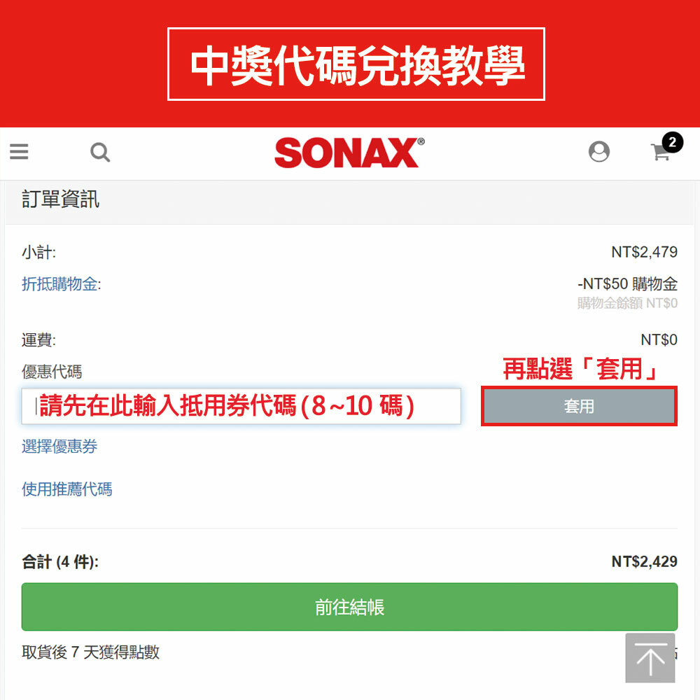 ■ 本刮刮卡限使用於SONAX官方商城(https://shop.sonax.com.tw/),不適用於其他平台使用。