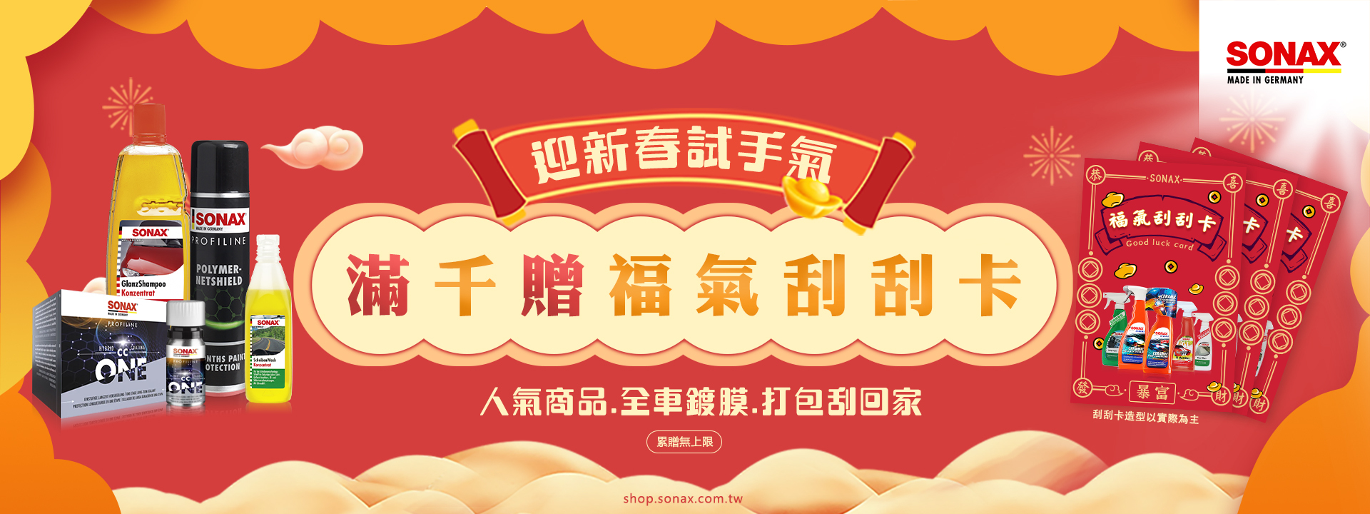 於2022/1/1~2/6 單筆消費每滿千即贈|限量福氣刮刮卡(張張有獎),更有機會刮出『由SONAX原廠技師 專業施工 全車CCONE 市價$20000』