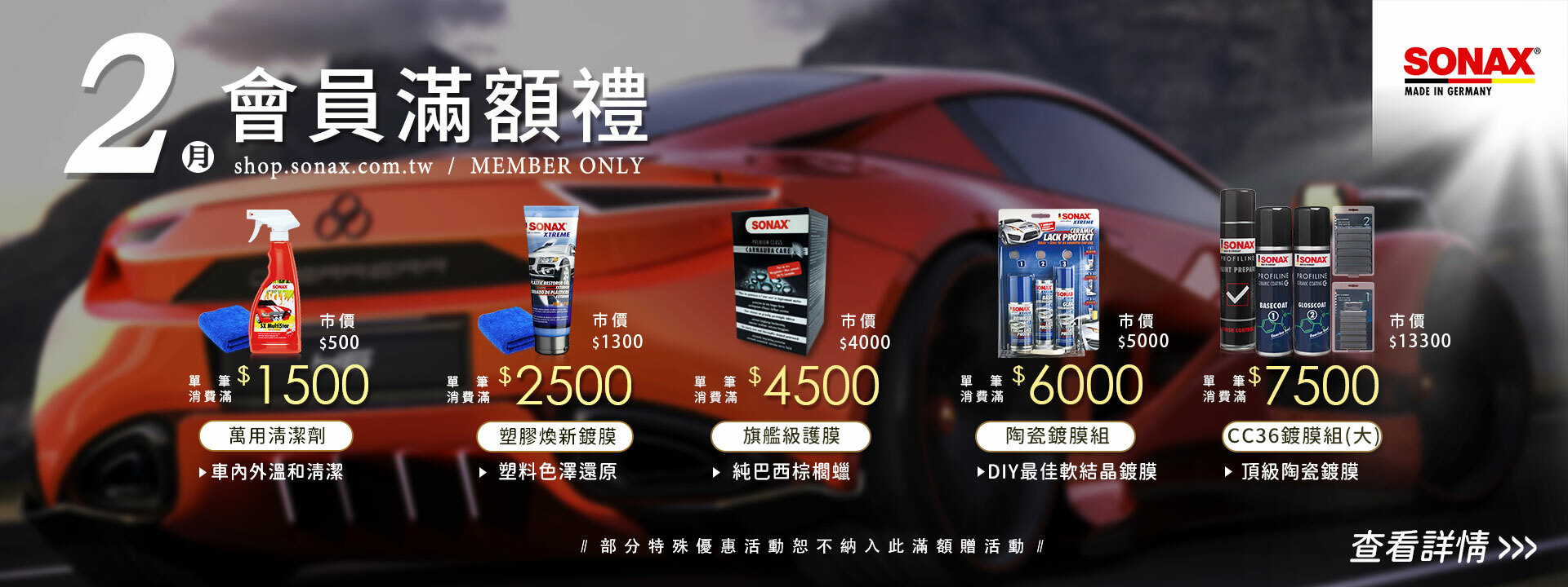 1. 本活動為SONAX官方商城獨家優惠(https://shop.sonax.com.tw/),其他平台恕不適用。