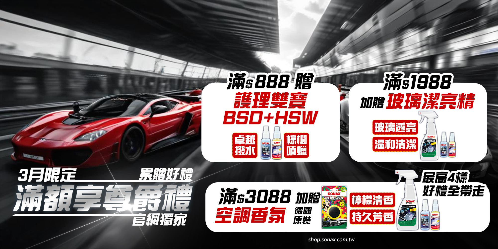 1. 本活動為SONAX官方商城獨家優惠(https://shop.sonax.com.tw/),其他平台恕不適用。