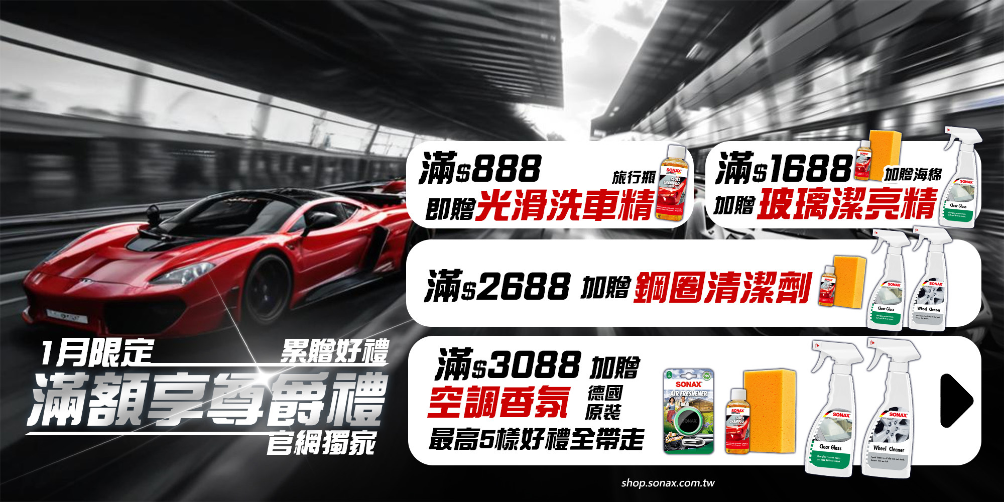 1. 本活動為SONAX官方商城獨家優惠(https://shop.sonax.com.tw/),其他平台恕不適用。