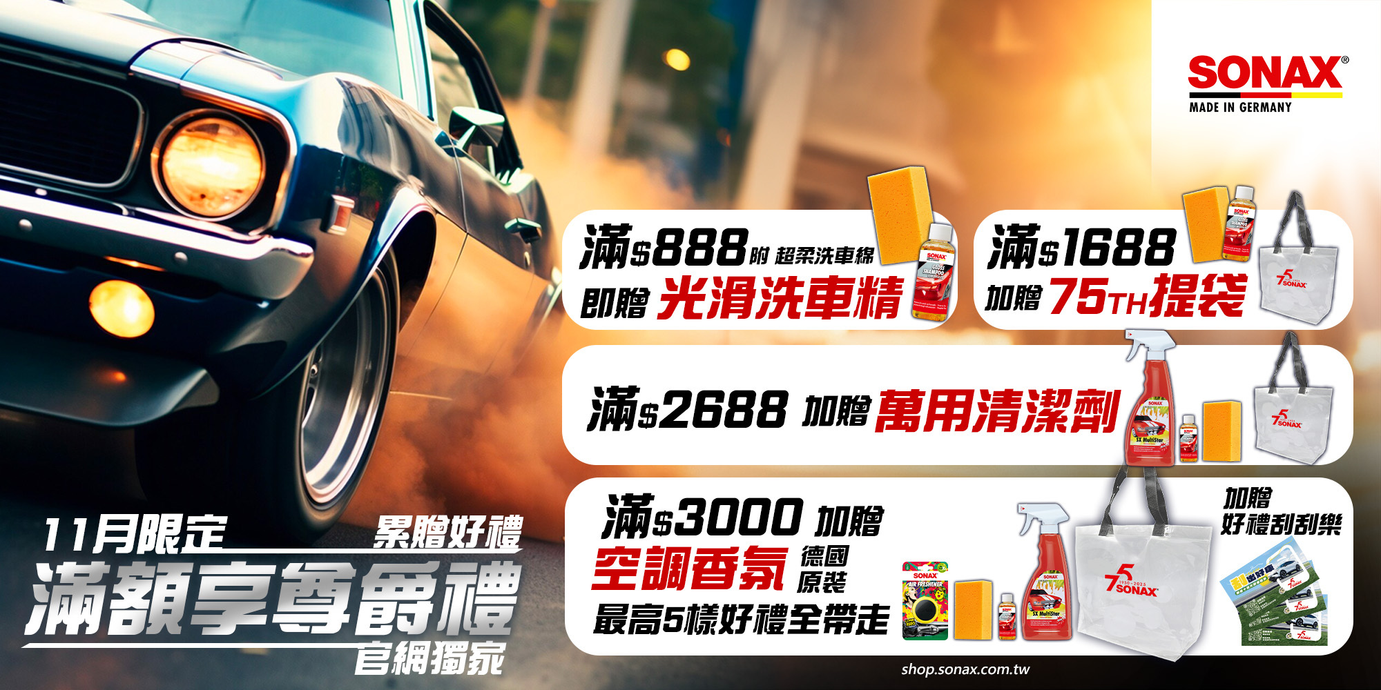 1. 本活動為SONAX官方商城獨家優惠(https://shop.sonax.com.tw/),其他平台恕不適用。