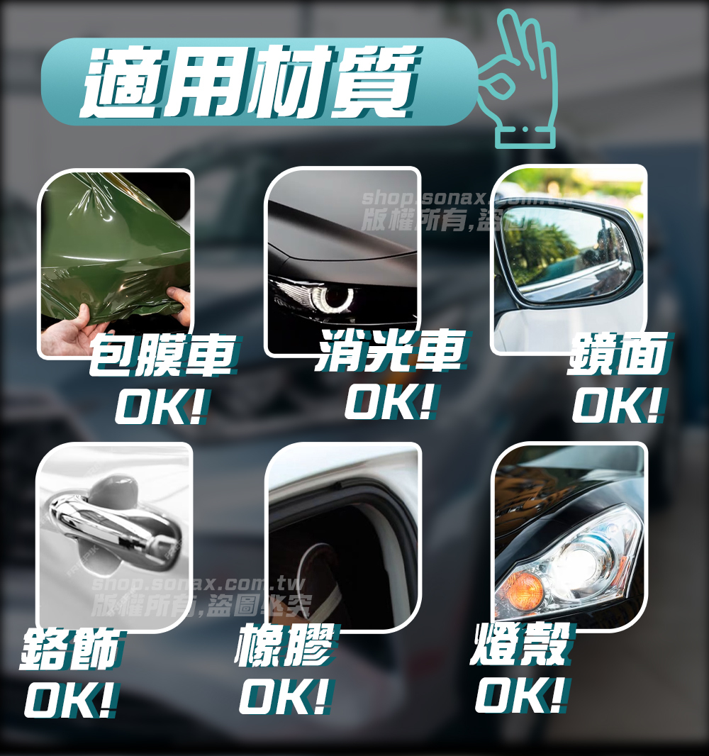 烤漆、玻璃、燈殼、塑膠、鍍鉻、金屬等幾乎所有部位的輕水痕都可以使用。