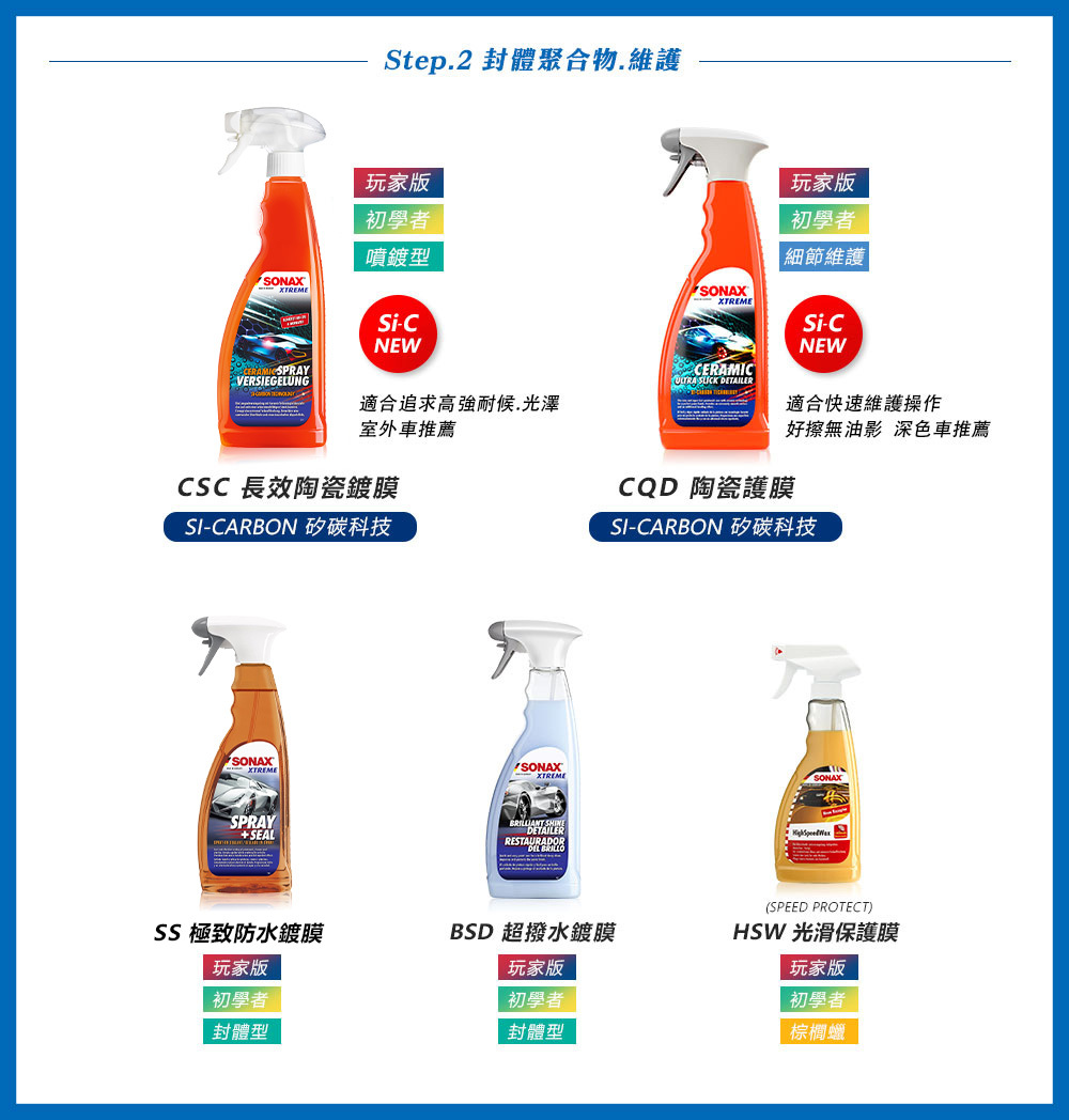 SONAX 蠟品可以選擇【旗艦級護膜(純棕櫚蠟)】【Wax1長效奈米護膜】【車漆硬護膜】等蠟品來進行上蠟,操作上盡量降低物理摩擦。