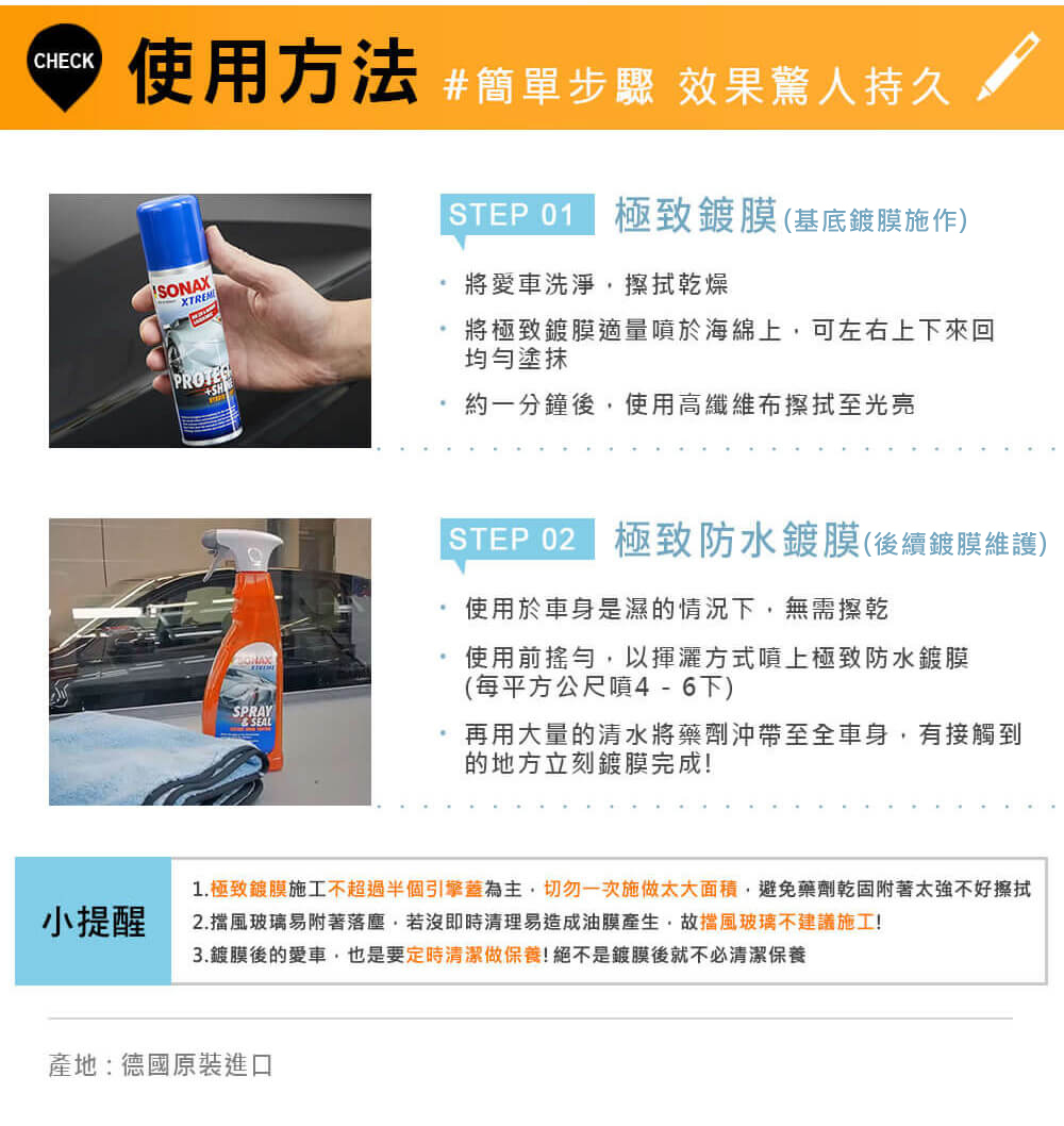 SONAX 蠟品可以選擇【旗艦級護膜(純棕櫚蠟)】【Wax1長效奈米護膜】【車漆硬護膜】等蠟品來進行上蠟,操作上盡量降低物理摩擦。