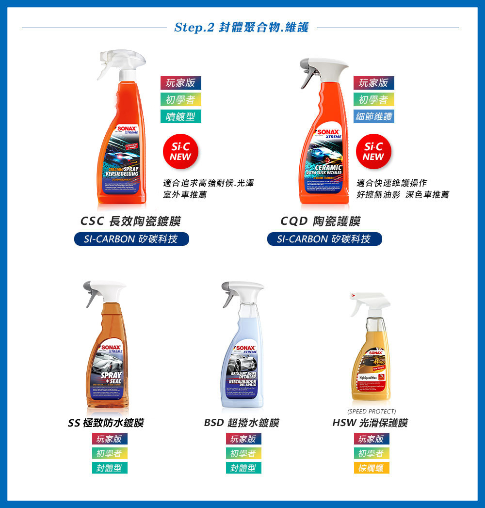 SONAX 蠟品可以選擇【旗艦級護膜(純棕櫚蠟)】【Wax1長效奈米護膜】【車漆硬護膜】等蠟品來進行上蠟,操作上盡量降低物理摩擦。