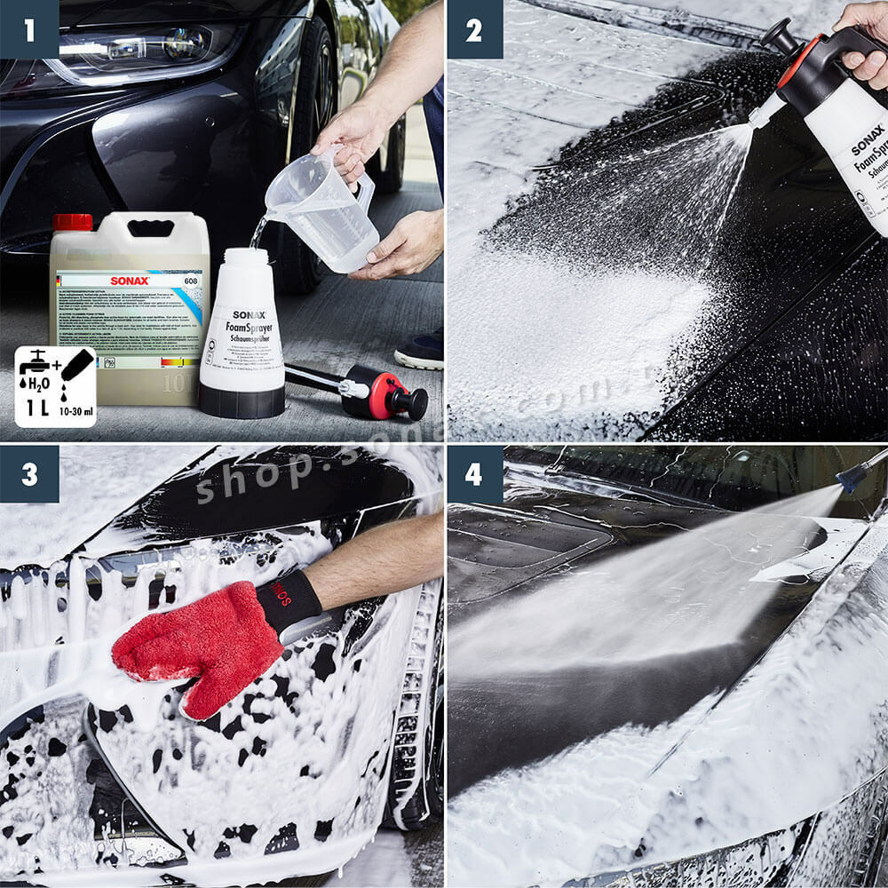 SONAX洗車精暢銷全球,高成本研發出通過歐盟嚴格標準檢驗與TÜV認證的中性.無磷產品,真正濃縮比例,同時有效清潔汙垢,適合用於所有漆面與塑膠材質,亦是鍍膜後最佳的專用洗車精。
