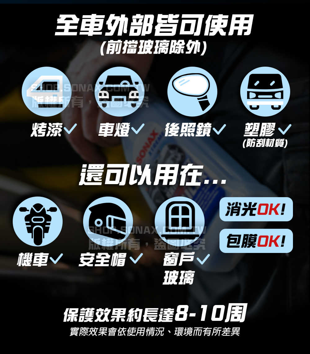 A: SONAX極致鍍膜與石英鍍膜皆為基底鍍膜,屬於結構強度較強的底層鍍膜,針對烤漆、燈殼、車輛外部飾件或防刮塑料都可以鍍膜。