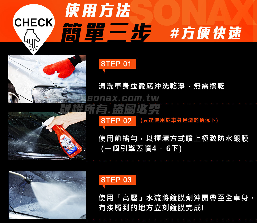 ✅ SONAX極致防水鍍膜可提供光亮及滑溜如絲綢般觸感,適用於烤漆(消光漆).鍍鉻.塑料和玻璃。