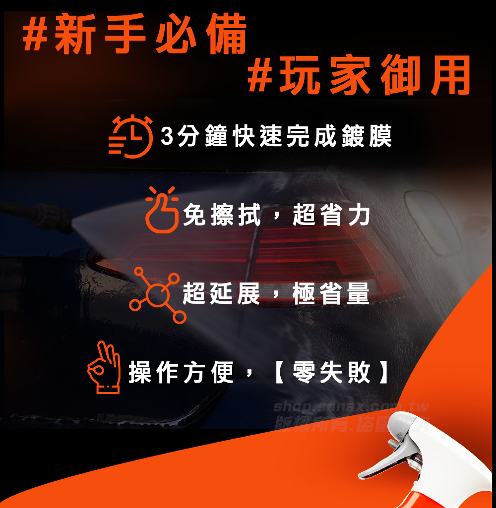 車身濕潤,揮灑噴上,再以高壓水槍沖開即完成鍍膜護理