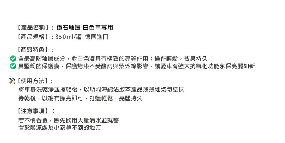 高階釉蠟成分,對白色車漆具有極致的亮麗作用