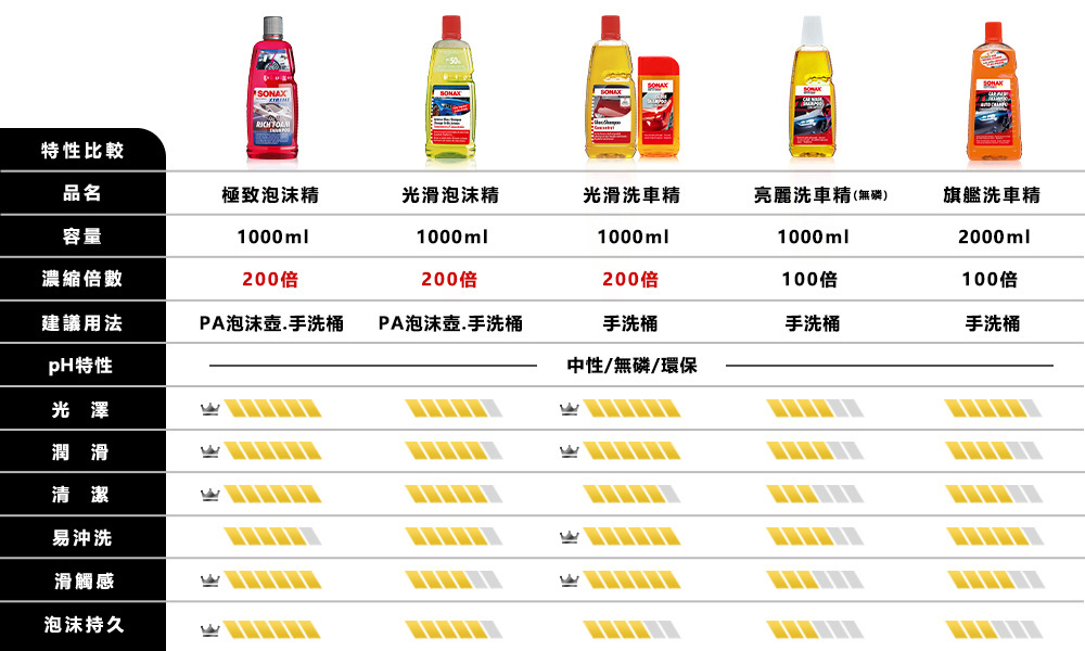 SONAX洗車精暢銷全球,高成本研發出通過歐盟嚴格標準檢驗與TÜV認證的中性.無磷產品,真正濃縮比例,同時有效清潔汙垢,適合用於所有漆面與塑膠材質,亦是鍍膜後最佳的專用洗車精。