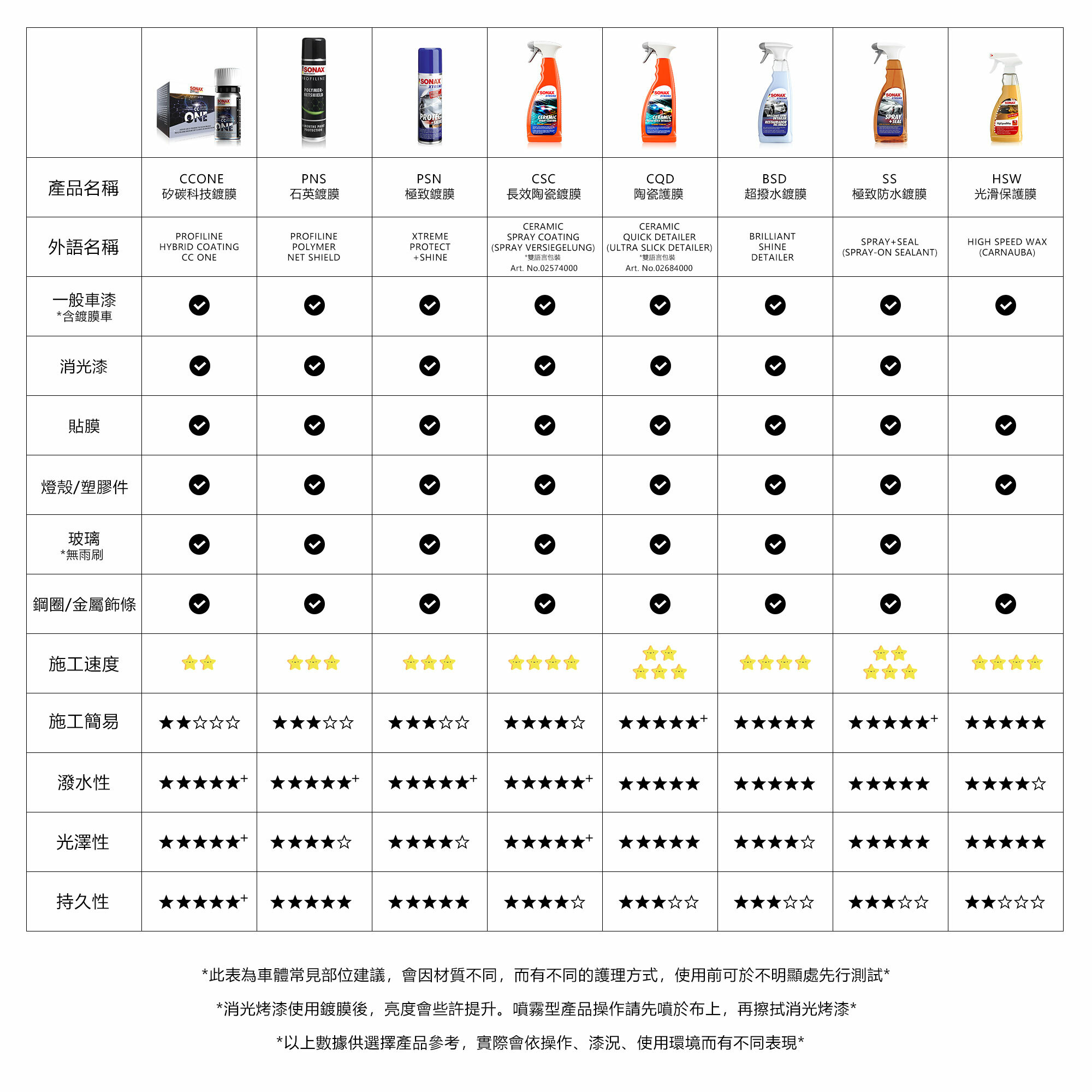 SONAX 蠟品可以選擇【旗艦級護膜(純棕櫚蠟)】【Wax1長效奈米護膜】【車漆硬護膜】等蠟品來進行上蠟,操作上盡量降低物理摩擦。