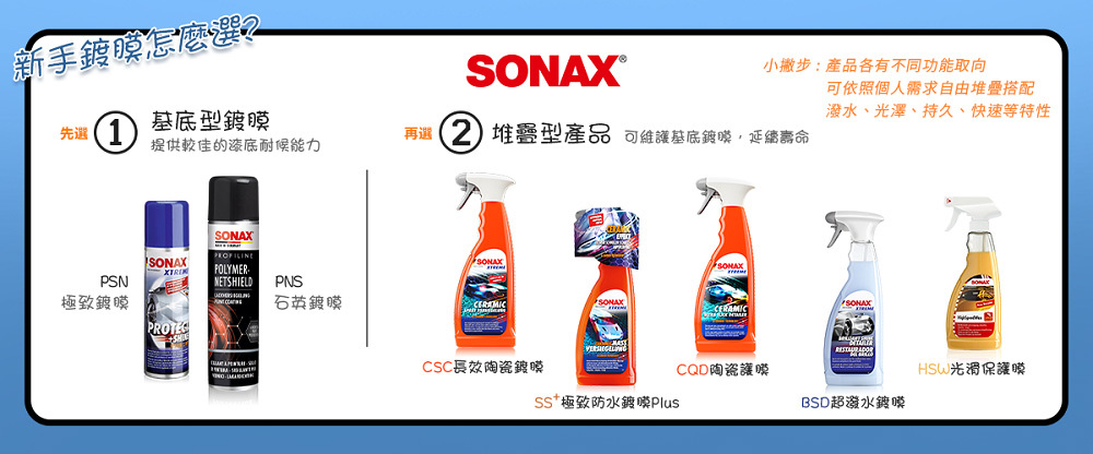 SONAX 蠟品可以選擇【旗艦級護膜(純棕櫚蠟)】【Wax1長效奈米護膜】【車漆硬護膜】等蠟品來進行上蠟,操作上盡量降低物理摩擦。
