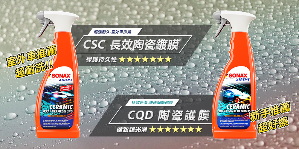A: SONAX極致鍍膜與石英鍍膜皆為基底鍍膜,屬於結構強度較強的底層鍍膜,針對烤漆、燈殼、車輛外部飾件或防刮塑料都可以鍍膜。