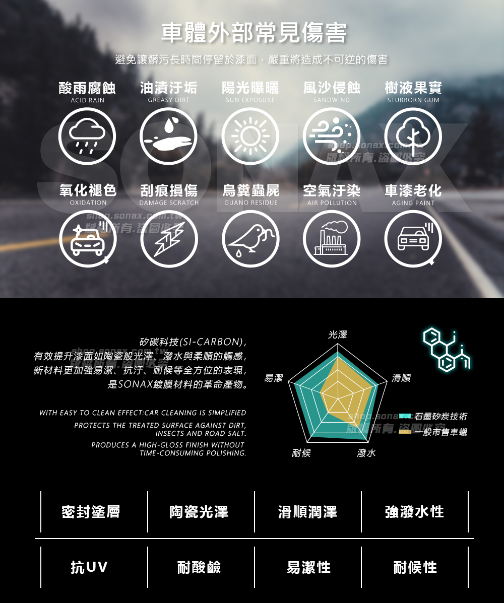 A: SONAX鍍膜採用獨家專利材料Hybrid NPT研發製作 (新款產品則加入SIC矽碳科技材料),為軟結晶鍍膜,與市售鍍膜最大不同就是韌性的提升,面對外力或髒汙侵蝕時將發揮以柔克剛的原理來保護車漆。