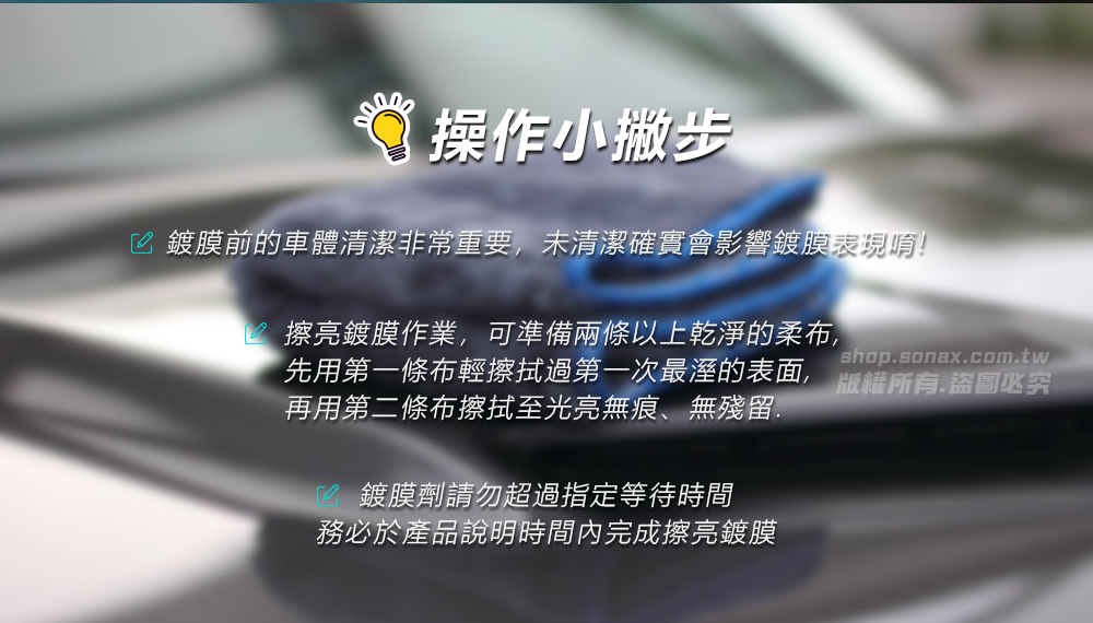 有些專業店家操作SONAX軟晶鍍膜也會搭配短波紅外線烤燈,也可以加速鍍膜的成形,是更有效率的做法。