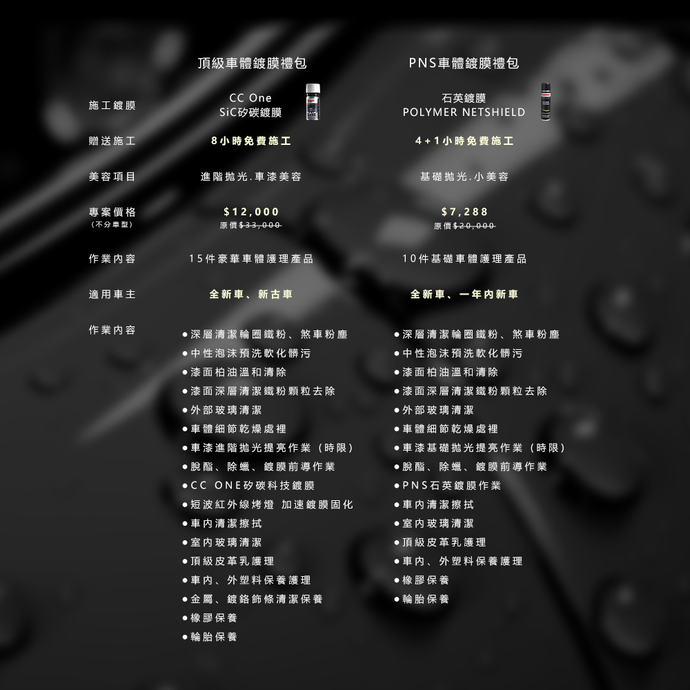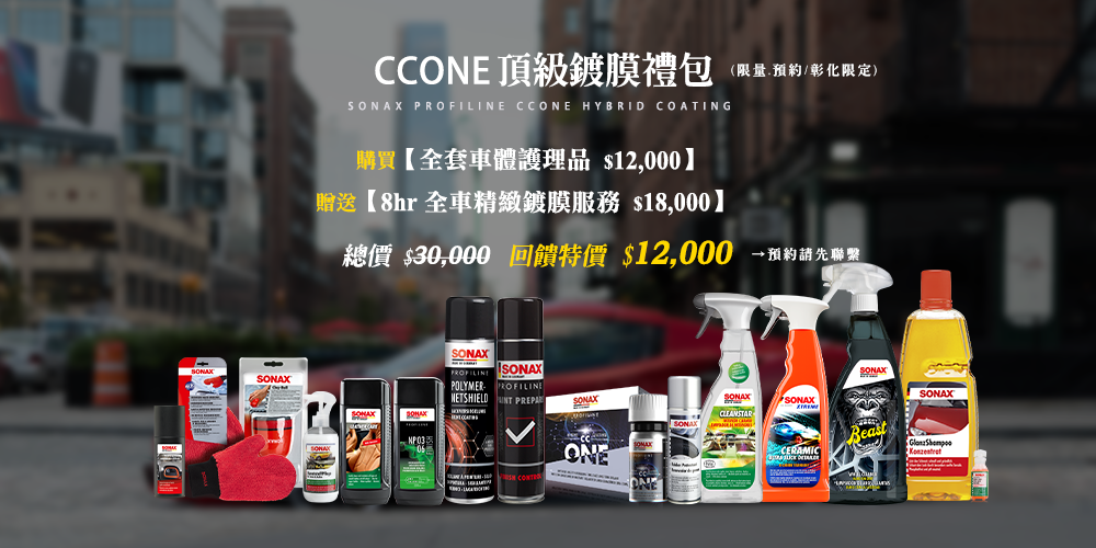 買【CCOne頂級車體鍍膜禮包 $12,000】贈【 8HR 全車 CCOne 精緻鍍膜服務 $18,000】