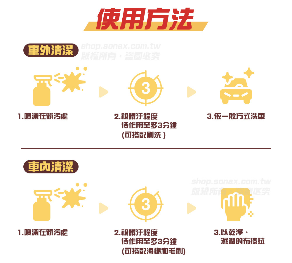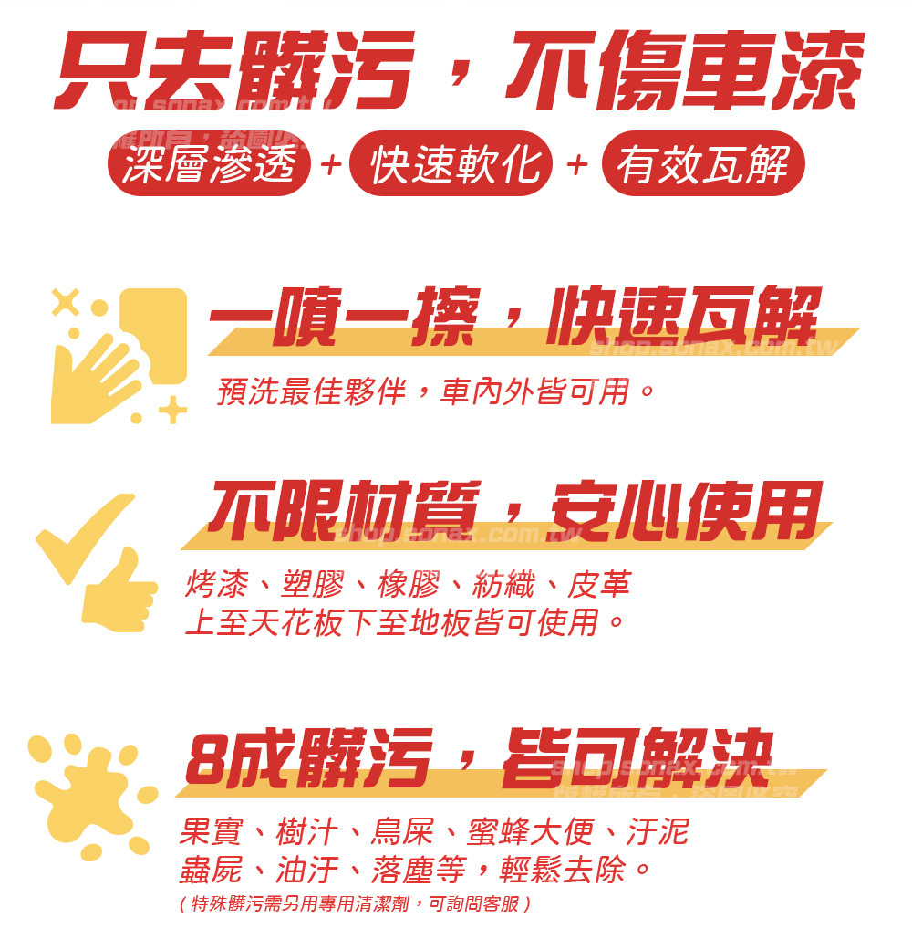洗車前,用於預先去除嚴重髒汙的表面,可輕鬆快速地去除玻璃,烤漆和塑膠上的昆蟲屍斑、油脂、油膏、汽油和柴油的汙垢。