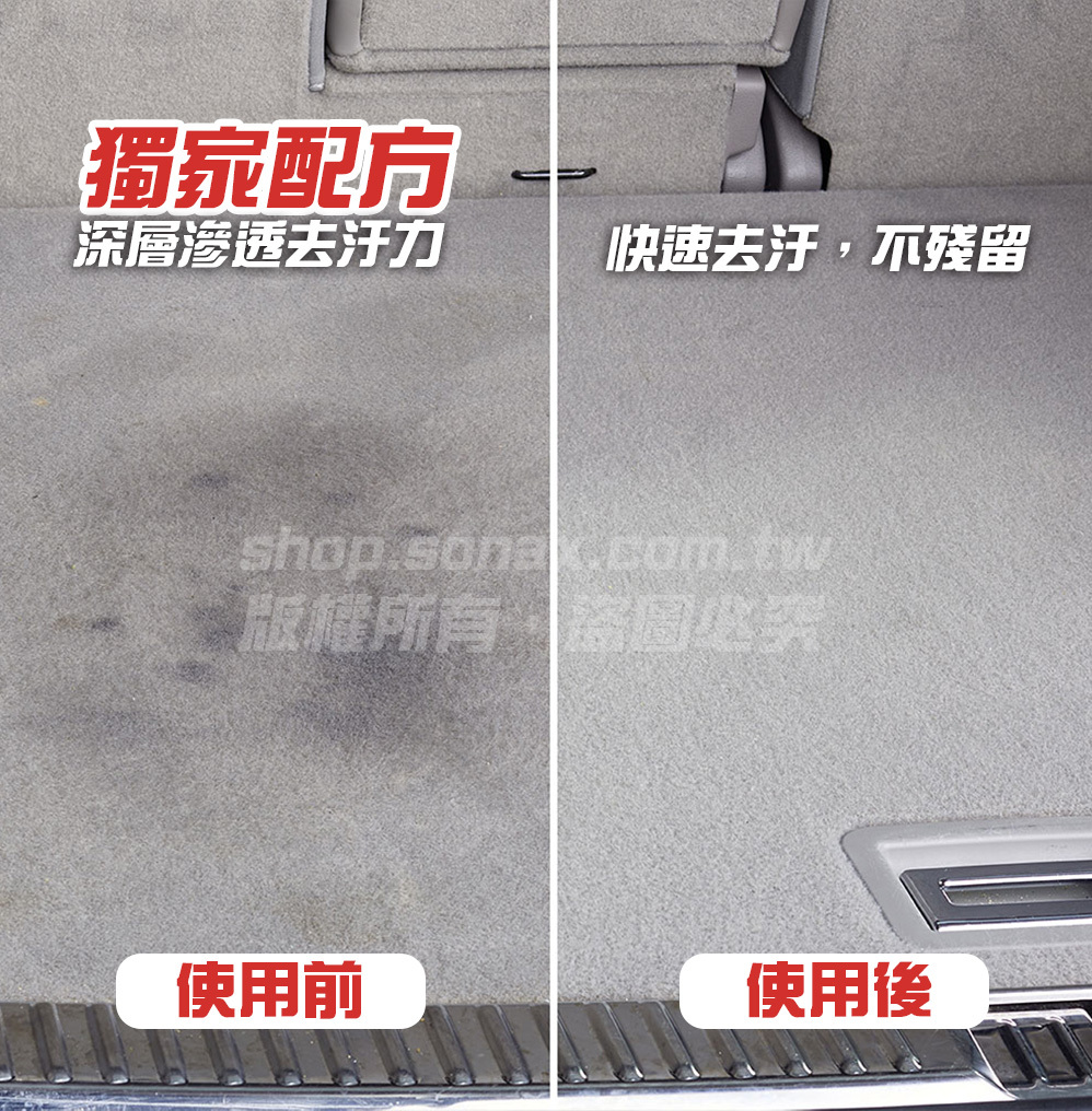 可去除天花板、車內飾條、布座椅、紡織品、地毯和塑膠表面上的汙垢。