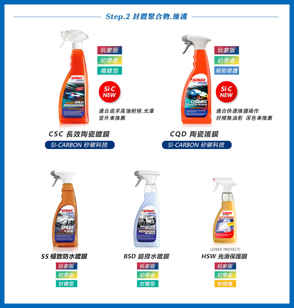 SONAX 蠟品可以選擇【旗艦級護膜(純棕櫚蠟)】【Wax1長效奈米護膜】【車漆硬護膜】等蠟品來進行上蠟,操作上盡量降低物理摩擦。
