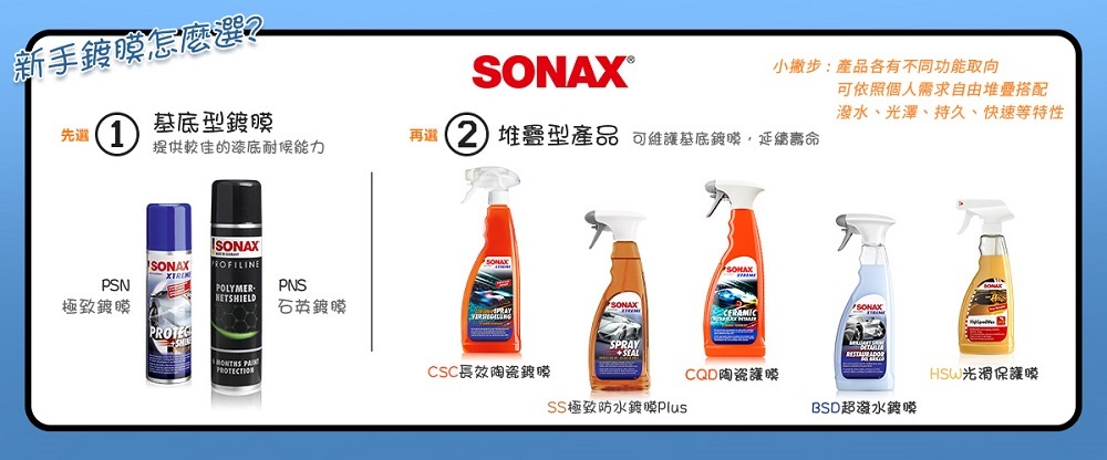 SONAX 蠟品可以選擇【旗艦級護膜(純棕櫚蠟)】【Wax1長效奈米護膜】【車漆硬護膜】等蠟品來進行上蠟,操作上盡量降低物理摩擦。